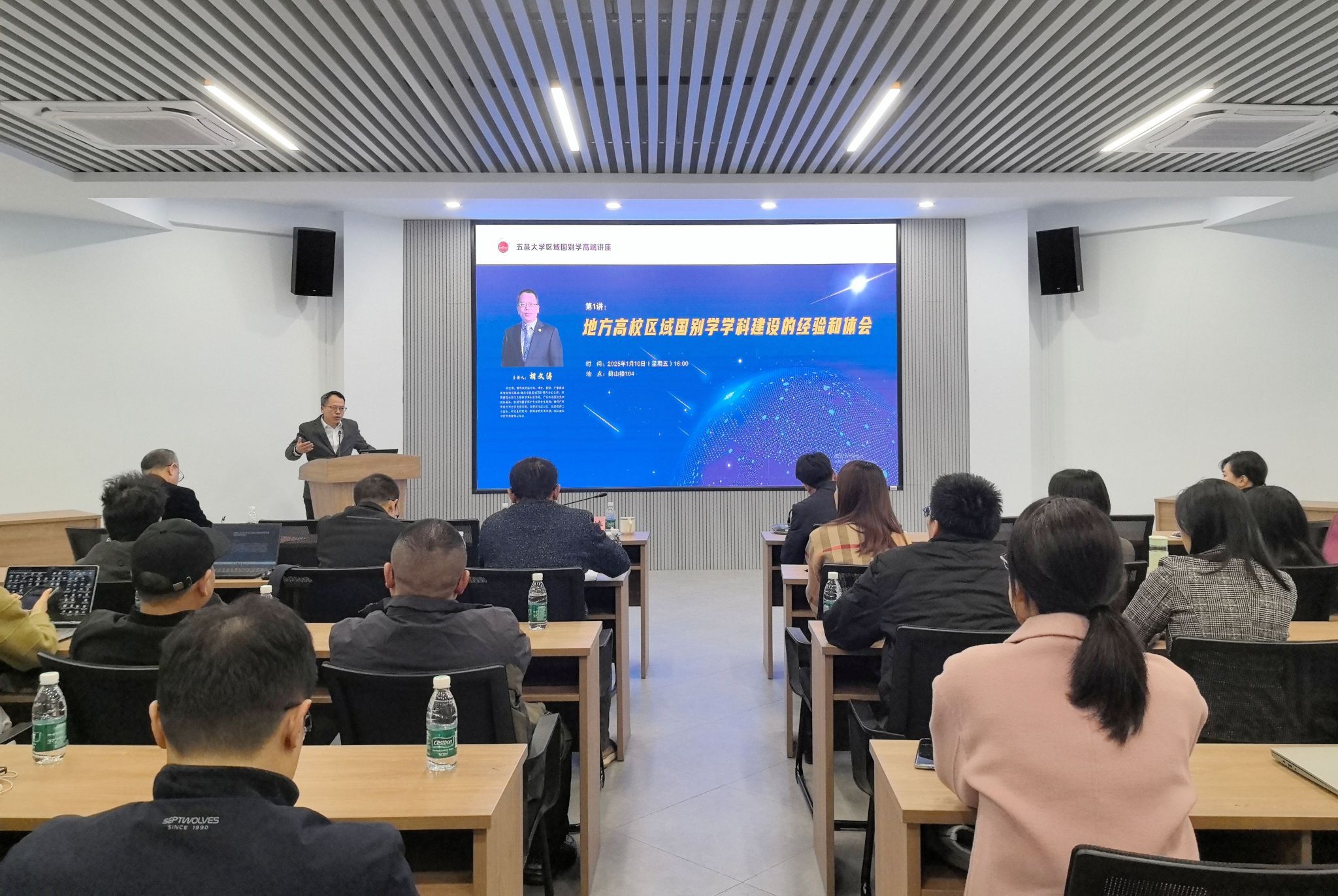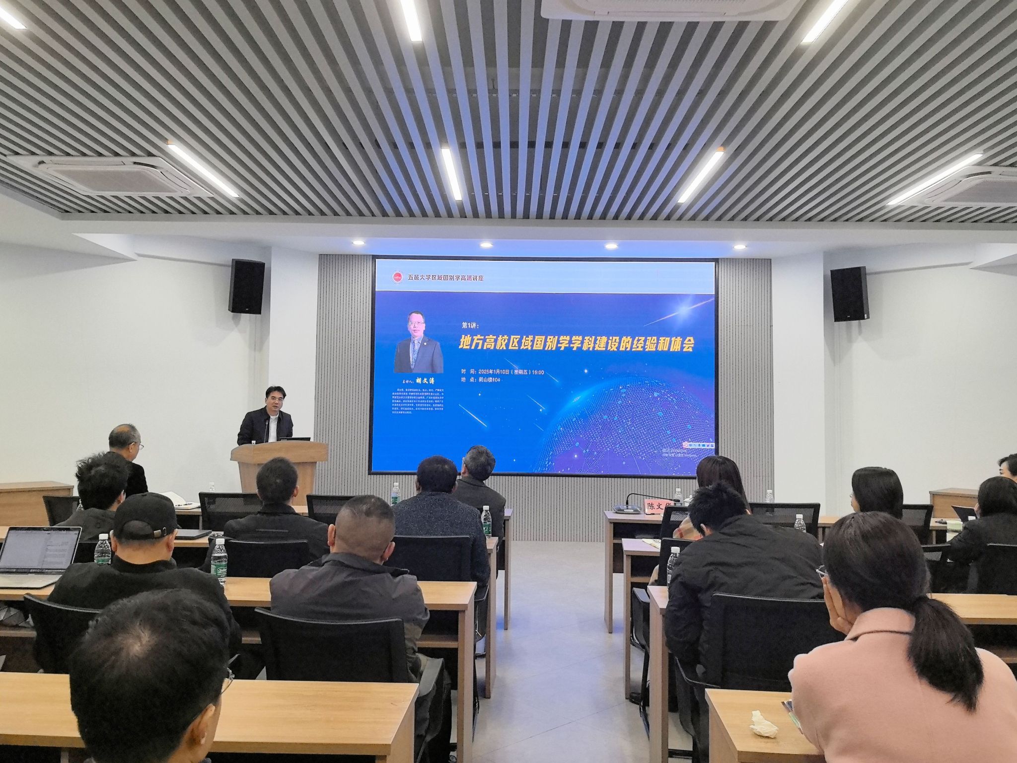 2025年1月10日,五邑大学首开区域国别学高端讲座,williamhill威廉希尔官网副校长、区域国别研究中心主任胡文涛教授应邀作第一讲。五邑大学党委常委、副校长陈文华,相关职能部门负责人、各文科学院负责人和教师近50人聆听了讲座。