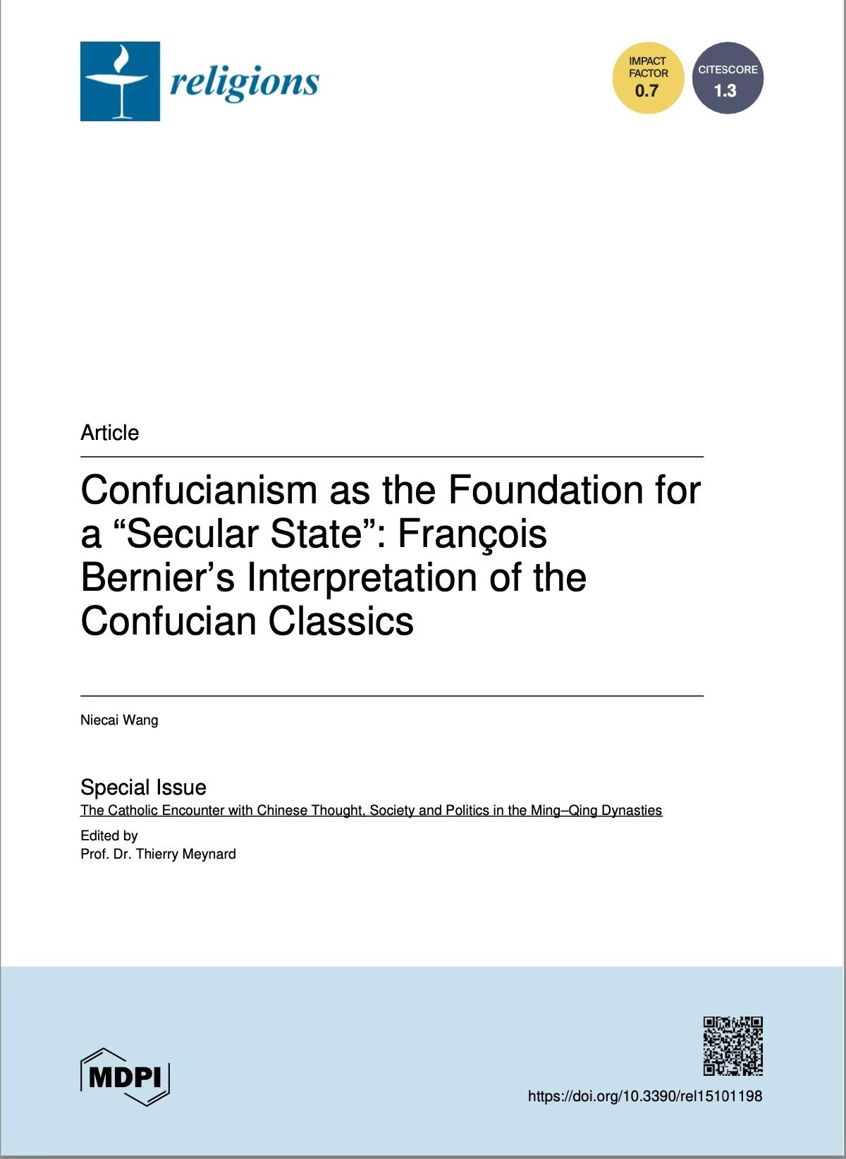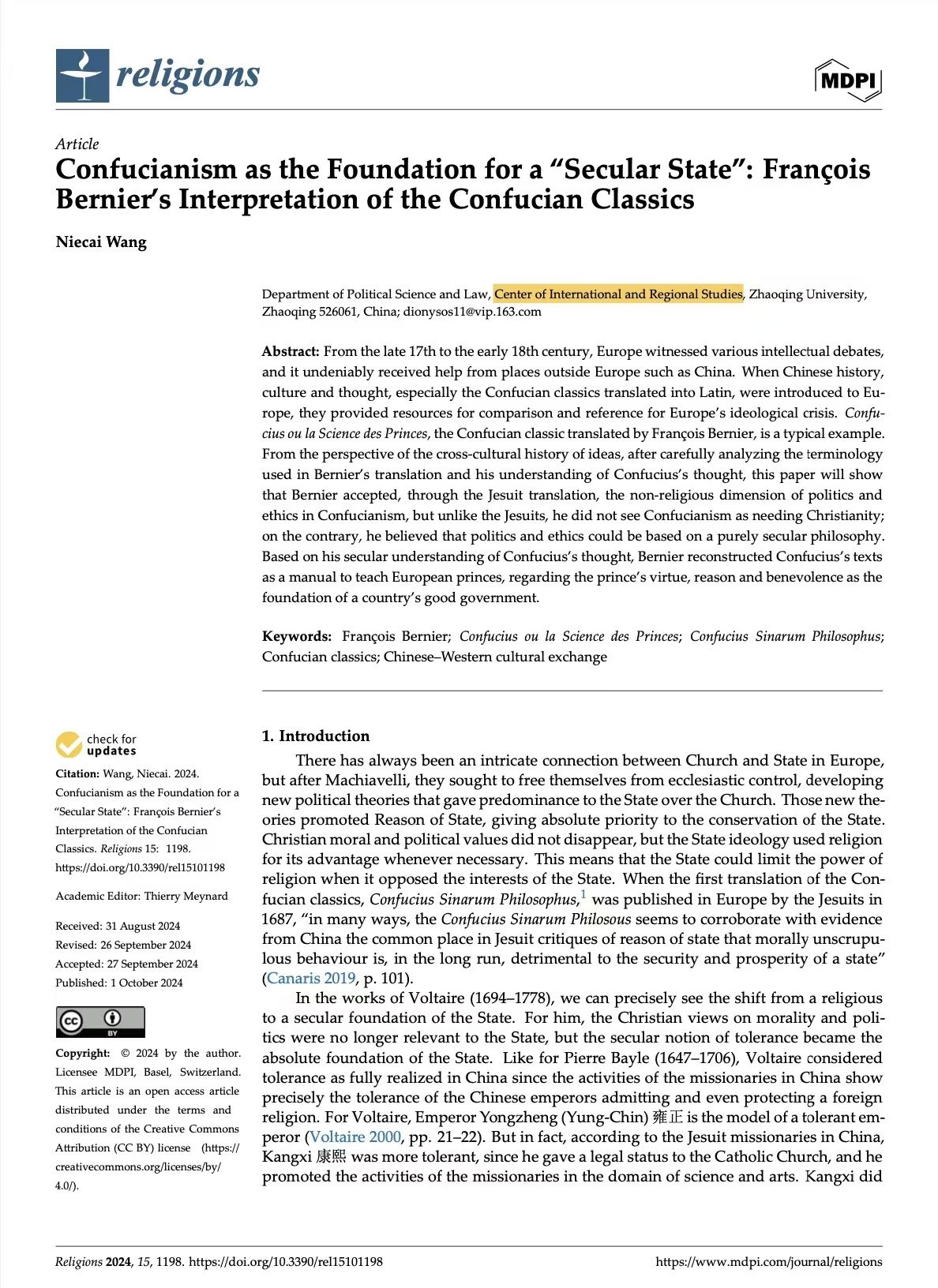 williamhill威廉希尔官网汪聂才博士在A&HCI期刊Religions发表英文论文:Confucianism as the Foundation for a “Secular State”: François Bernier’s Interpretation of the Confucian Classics
